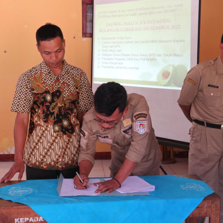 Meresmikan BUMDESMA (BUMDesa Bersama) dan penandatanganan oleh Kepala desa dan Ketua BPD.